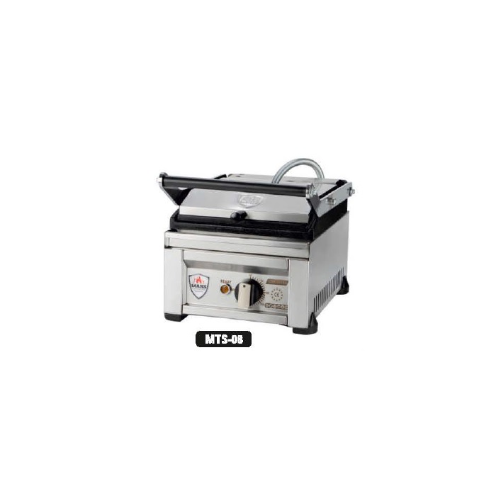 Электрический контактный гриль предназначен для жарки мяса, птицы, рыбы, овощей, а также для приготовления стейков, гамбургеров и горячих сэндвичей на предприятиях пищевой промышленности, общественного питания и торговли. Модель оснащена откидной крышкой с основной горизонтальной рукояткой, малой вспомогательной рукояткой, устойчивыми нескользящими опорами и электромеханической панелью управления. Корпус выполнен из нержавеющей стали, накладки на рукоятках – из термостойкого пластика.