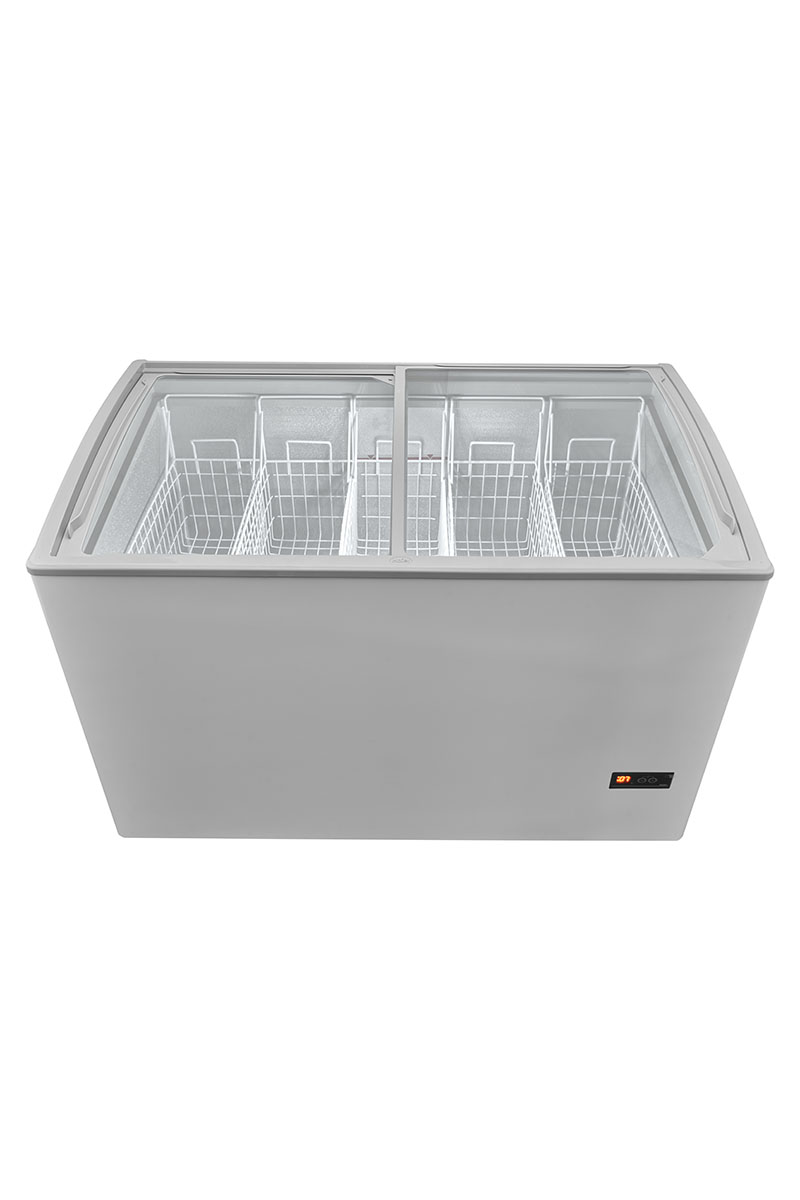 Для удобства использования предусмотрены дисплей электронного контроля температуры, система разморозки слива, подсветка внутри ларя. Комплект изделия включает в себя: колеса, замок, корзины, 2-метровый шнур.